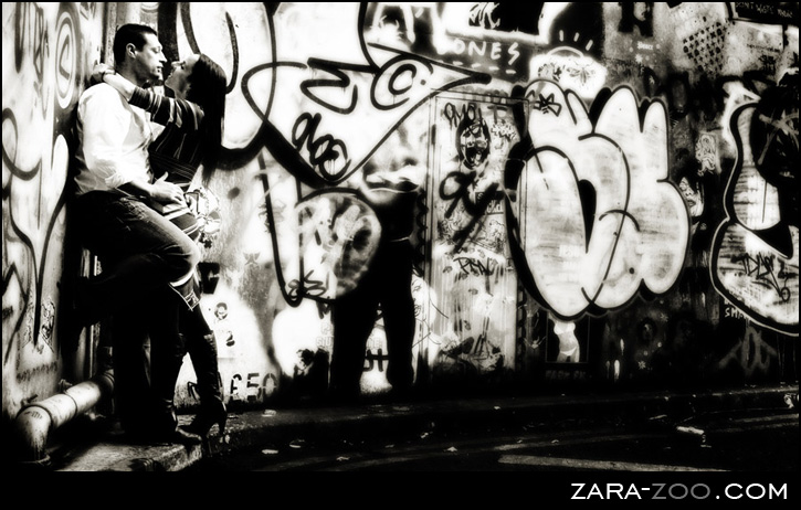 Add some edge to your wedding day! When I think of clean white wedding dresses, my first thought for a picturesque backdrop is not graffiti, but it works! The colorful art contrasting against the clean lines of the white dress and black tux create vivid pictures on your big day.